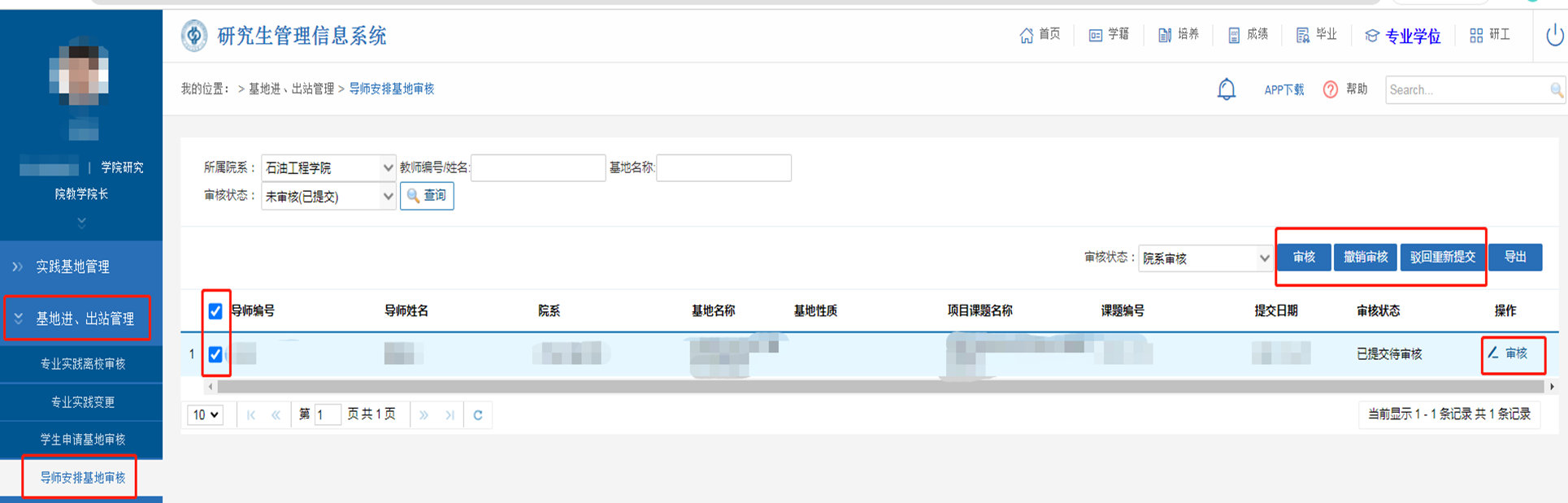 在【专业学位】-【基地进出站管理】-【导师安排基地审核】中勾选、审核;审核通过后,系统自动生成企业导师账号;