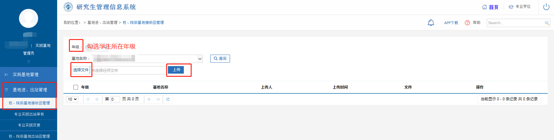 院办秘书在开具后的进站函上盖章后,可在【专业学位】-【基地进、出站管理】-【校、院级基地进站函上传】界面模块中上传。